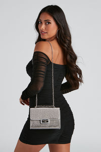 Create a magical shine with this rhinestone crossbody bag featuring a flap turn-lock closure, adjustable chain-link strap, and a spacious interior with a zipper pocket. Complete your enchanting look in glam heels.