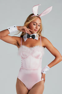 Channel your inner vixen this Halloween as a sultry bunny. The set features rhinestone embellished ears and a matching bunny tail. Complete the costume with the matching velvet bodysuit and cuffs.