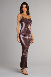 Slip into something sleek—this mesh maxi dress flaunts an abstract floral print that gives the illusion of an hourglass figure for an effortless allure at every event you're seen at!
