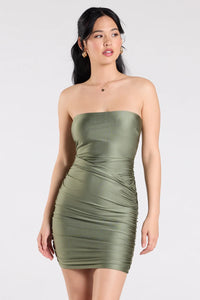 A mini dress that effortlessly combines sultry and glam! Strut into any party or event in this stunning dress boasting an off-the-shoulder neckline to show some skin and a ruched bodycon silhouette that fits like a glove.