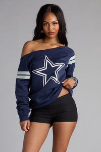 Big star energy—this Dallas Cowboys off-the-shoulder pull-over top is sporty, cozy, and lowkey flirty. Perfect for layering on game day or keeping it casual with your weekend 'fit.