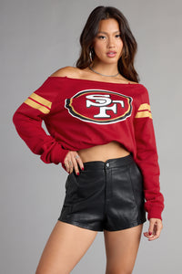 Cute, cozy, and a little off-duty chic—this pullover top knows how to rep in style. With its slouchy off-the-shoulder neckline and San Francisco 49ers graphic, it’s a win-win look for game day and beyond.