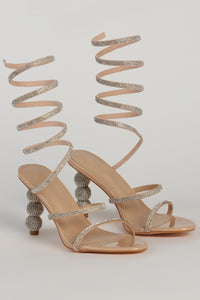 - Rhinestone embellished straps, spiral ankle