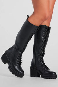 These sleek faux leather combat boots will give your fall 'fits that edgy allure! They feature an under-the-knee height, a round toe, a complete lace-up front design, an inner zipper closure for comfortable wear, a platform lug sole, and a block heel. Style with a mini skirt and a cropped sweater.