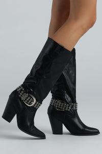 Strut your fashion self with authority in these faux leather western boots! They feature a pointed toe, a stacked block heel, a trendy belt with a buckle accent, an under-the-knee calf-length shaft, and pull-on-and-off styling. Complete the look in a cowboy hat for a bachelorette or country concert!