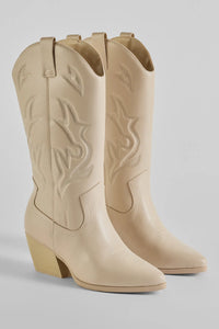 Showcase an adorable strut in these under-the-knee cowboy boots that will have you giving off country babe vibes! Made with sleek faux leather with western-style embroidery, they feature a pointed toe and a stacked block heel for comfortable wear. Pair with a skater dress for a cute and casual date look.