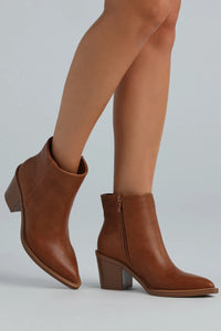 A pair of faux leather heels featuring a sleek almond toe, block heel, and a closed ankle with a zipper closure to secure the style. Perfect for everyday wear.