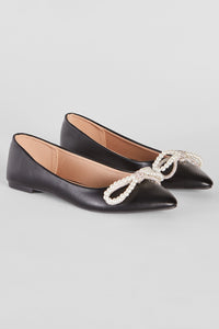 These chic rhinestone bow ballet flats will give off that elegant sparkle, a perfect alternate for heels! They feature a closed pointed toe, rhinestone and faux pearl bow accents, a closed back, a comfortable flat sole, a cushioned insole, and a sleek faux leather exterior. Style with an envelope clutch.