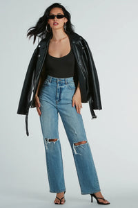Create iconic night-out 'fits with this sexy strappy back bodysuit! Designed with a stretchy brushed knit fabric, this sultry bodysuit features a sleeveless V-neckline and spaghetti straps that lead to an alluring open-back design of cross-back straps and lower-back bar straps. Style this form-hugging bodysuit with boyfriend jeans and a faux leather jacket for bar-hopping!