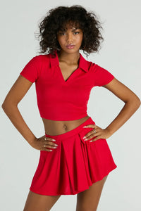 Game set and match! This collar crop top is in it for the win. It features short sleeves a trendy collar neckline, and a cropped hem on stretchy rib knit fabric. Complete the look with the matching bottoms.