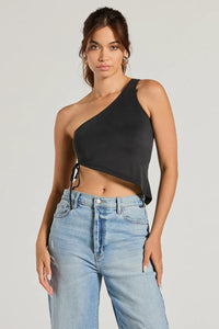 For an effortless flirty outfit, pair this one-shoulder crop top with a trendy pair of denim! It features a single shoulder strap, an adjustable side drawstring to let you customize the fit, and an asymmetrical cropped hem on soft knit fabric. Complete the look in a denim midi skirt and sneakers.