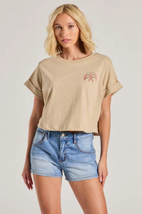 Spread some good vibes in this graphic tee all season! The tee features cuffed short sleeves, a crew neckline, front and back horseshoe and bow graphic, a script that reads "Good Luck", and a cropped hem. Complete the look in jean shorts and sandals for casual plans!