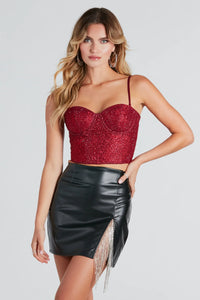 This gorgeous bustier makes for a glam surprise guest at parties! The sweetheart neckline and built-in padded underwire bust flatters and supports while the detachable and adjustable straps provide a perfect fit. This bustier crop top has finishing touches with front rhinestone embellishments, flexible boning, and a unique back with tulle glitter polka dots and multiple hook and eye closures. Complete the look in boyfriend jeans and mules!
