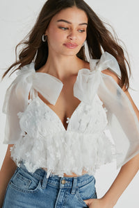Bloom into the babe you are in this adorable babydoll crop top as the gorgeous bride-to-be or birthday girl! With a plunging V-neckline and statement tulle bow straps, this top is the perfect combination of elegance and allure. The low-cut open back and babydoll seam add a touch of sensuality, while the 3D floral appliques provide a romantic feel! Style this babydoll top with high-rise jeans, cute sandals, and a necklace for a chic look.
