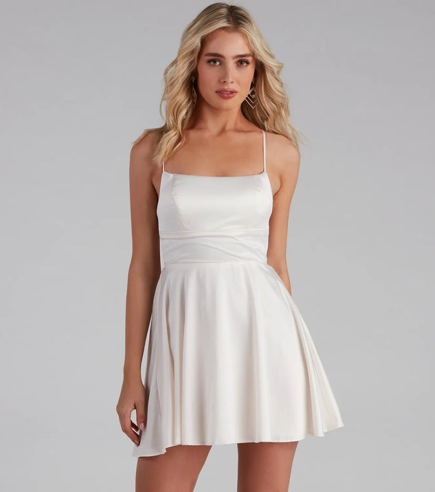Slay the night away in our beautiful Sonya satin skater dress! She features a sleeveless square neckline with a built-in padded bust for support, adjustable spaghetti straps, and a cross-back lace-up design that lets you adjust the fit. Her short skater skirt is flowy enough to make some dance moves tonight! The short dress is composed of a satin-like woven fabric fabric that has a very flattering finish. Style this dress with sparkling earrings and classic block heels.