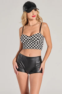 Showcase your need for speed in a racer costume this Halloween! The cropped bustier features a sleeveless sweetheart neckline with a padded bust, adjustable spaghetti straps for a secure fit, and a checkered print. Complete your outfit with the matching racer jacket, faux leather hot shorts, and sleek hoop earrings!