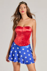 Reign with justice this Halloween in a bold satin corset featuring a strapless sweetheart neckline, hook and eye front closures for a secure fit, and a lace-up back design. Complete the costume with the matching star print skort, metal headband, and heels.