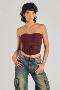 Keep it sweet and sultry with a strapless corset that features a sweetheart neckline with a lace and bow ribbon trim and a cropped hem with ruffled trim. Complete your outfit with faux leather pants for a GNO!