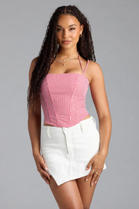 Perfect for a day out, this sweet gingham corset top is designed to charm! With a lace-up back and gingham pattern, this top will give you a flattering silhouette while adding a touch of vintage flair to any outfit.