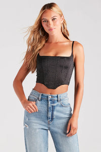 Bring the heat to your night-out festivities in this glimmering rhinestone satin corset top! It features a sleeveless square neckline, adjustable spaghetti straps for a customized fit, a corset-designed bodice with flexible boning inserts to provide structure, and a fitted, angled, and cropped hem. The woven satin fabric features front mini rhinestone embellishments for a sultry sparkle! Complete your look with a faux leather mini skirt and platform heels.