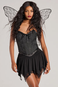 Major cutie will be your vibe this Halloween as Bo Peep in this silky satin corset top! It features a strapless sweetheart neckline with an adorable ruffled lace and tulle trim, a small bow accent at the center of the bust, a lace-up back for a customized fit, and an angled cropped hem. Complete your costume with the lace hot shorts, the wicker handbag, rhinestone earrings, and the chain-link choker necklace.