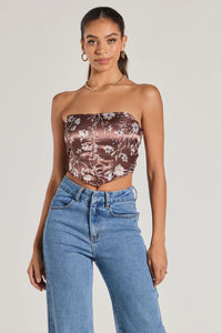 Flirty with a chic sheen, this floral satin corset top features a strapless straight-across neckline, a lace-up back design for a customized fit, and a fitted cropped hanky hem. Style with high-rise jeans and mules.