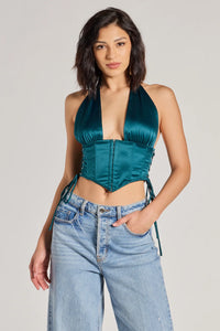 Part edgy, part luxe, this satin corset top is what you need for your next GNO! The halter features neck ties for a secure fit, hook and eye front closures, and lattice ties at each side. Pair with low-rise jeans and heels.
