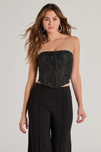 Steal the show and look amazing in this strapless corset top paired with your favorite bottoms for a saucy night on the town! Featuring a strapless neckline and hidden front hook and eye fasteners, this top is so chic. The flexible boning provides a flattering silhouette, while the lace-up back adds a touch of romance. The lace-beaded embellished woven fabric is the perfect finishing touch. Complete the look in high-rise denim jeans and stilettos!
