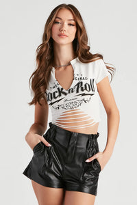 Flaunt your original status as a rock babe in this edgy graphic tee featuring short sleeves, a crew neck with a V-cut notch, a slashed hem, and a front script that reads, "The Original Rock N Roll". Complete the look in sleek faux leather shorts for a concert!