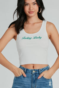 Spread your charming luck in this graphic tank top perfect for St. Patrick's Day parties and bars! Crafted from a soft rib knit fabric, this tank top highlights your flattering figure in a scoop neckline and fitted crop hem and a cheeky front graphic script that reads, "Feeling Lucky". Pair with a denim mini skirt to complete your cute look!