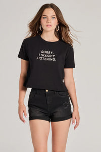 A graphic crop tee featuring classic short sleeves and a crew neckline with a front script that reads "Sorry I Wasn't Listening". Perfect for casual styling with shorts.