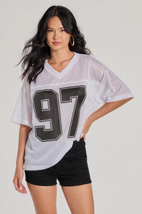 This trendy oversized jersey is perf for the sporty babes. Designed with an open jersey mesh fabric, the casual tee features a V-neckline, short sleeves, a mid-length hem with an oversized fit, and a contrasting "97" screen on the front. Style with boyfriend jeans and sneakers for weekend game days!