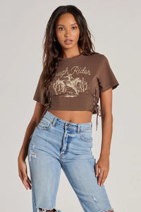 Channel that trendy western vibe with this cropped graphic tee featuring a crew neck, short sleeves, bold lace-up sides, and a cowboy and horse graphic in desert scenery with the script "Rough Rider" in a rope-like font. Style with distressed jeans and booties!