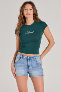 Channel the iconic brat aesthetic in this cute graphic tee featuring a crew neckline, short cap sleeves, a cursive script reading "Brat," and a fitted cropped hem. Style with cargo pants and sneakers for a trendy everyday 'fit.