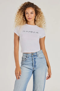 This graphic tee features a classic crew neckline, short sleeves, and a sassy front graphic script that reads "I'm Too Pretty For This" along the cropped fitted hem. Perfect for casual styling with jeans or a skirt.
