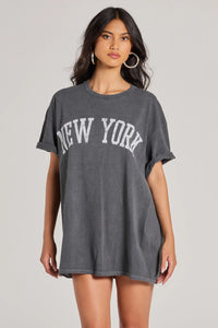 Show your love for the Big Apple in this oversized graphic tee featuring classic short sleeves, a crew neckline, and a front script that reads "New York" with a vintage-inspired look.