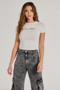 This trendy graphic tee features a crew neckline, short sleeves, a cursive script reading "Do Not Disturb," and a fitted cropped hem. Perf for a laidback weekend, style with jeans and sneakers.