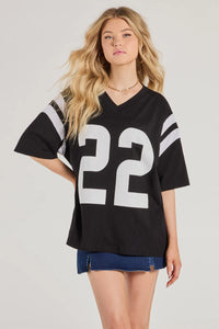 Channel a trendy sporty style in this oversized graphic tee featuring a V-neckline, short sleeves with a striped design, and a front "22" graphic. Perf for game day, style with a denim skort and sneakers.
