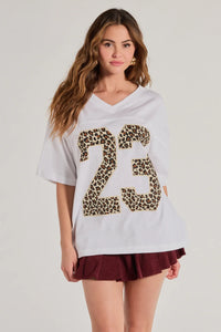 Create an adorable sporty look with this oversized graphic tee designed with a "23" front screen in a stylish leopard print. The top features a V-neckline, short sleeves, and a trendy oversized fit perf for pairing with a mini skirt and boots!