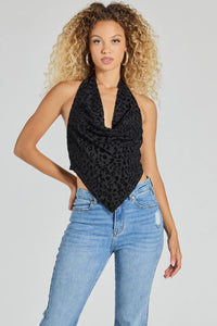 Add some allure to your night-out look with this flocked leopard print knit top featuring a halter cowl neckline, a bold open back with a lower tie-back design, and an asymmetric hanky hem. Perf for pairing with high-rise jeans and heels!