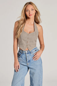 Made of sugar and spice, this plaid linen cropped vest charms everywhere you go! The linen-blend fabric showcases a small plaid pattern for an adorable classic vibe. It features a sleeveless V-neckline with a halter strap design, a partially open back, a button-down front, faux front pockets for cute added detail, and a fitted cropped hem. Style with a pleated skort!