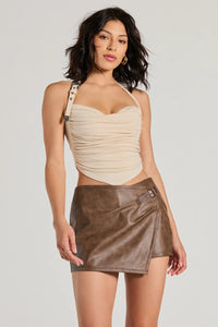 Level up the chic factor of your going-out look with this form-hugging wrap-front faux leather skort. It features a high-rise waist, a wrap-front design with an asymmetric hem layered over fitted shorts, a sleek faux buckle strap accent, and a hidden back zipper closure for a secure fit. Style a crop top and ankle booties for a trendy rooftop bar vibe!