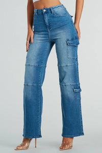 Capture effortless-cool style in these cargo denim jeans perfect for casual wear! They feature a flattering high-rise waist and straight-leg silhouette with trendy cargo flap pockets, seam detailing, and medium-wash denim fabric. Complete the look with a graphic tee and sneakers!