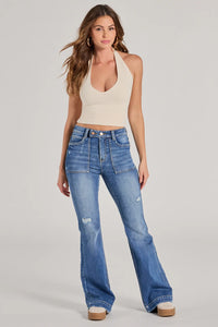 A pair of denim jeans feature a flattering mid-rise waist, a hip-hugging fit, and a flared hem for a throwback look. Perfect for everyday styling.