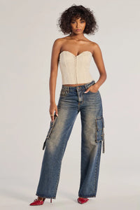 Come out as the top trendsetter in these high-rise denim jeans showcasing an edgy cargo design and a flattering wide-leg fit!