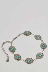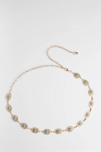 Accessorize your ride with this statement western chain belt featuring unique colored stones, oval-shaped charms, and an adjustable lobster clasp closure to secure the style. Complete the look in a fitted mini dress.
