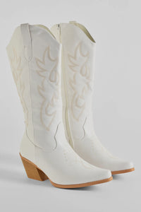 Show your love for country style with these under-the-knee cowboy boots, the perf addition to your fave 'fits. Designed with trendy western-style embroidery, they feature a classic pointed toe, an inner zipper closure for effortless on-and-off styling, and a stacked block heel for comfortable wear. Pair with a flowy short dress for a country concert!