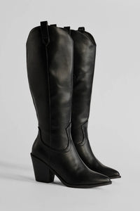 Flaunt your style in western sleek knee-high block heel boots. With a stacked heel, pointed toe, and pull tabs, these boots are your go-to for a chic, confident stride.