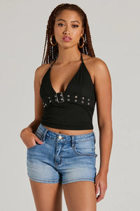 Denim, but make it daring. This halter crop top zips up the front and shines with grommet trim, perfect for concerts or nights out.