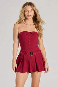 The perfect strapless romper for styling on the go! The romper is designed with a fold-over collar trim for a preppy allure while the pleated skater skirt overlay gives it a flirty touch. Pair with loafers.